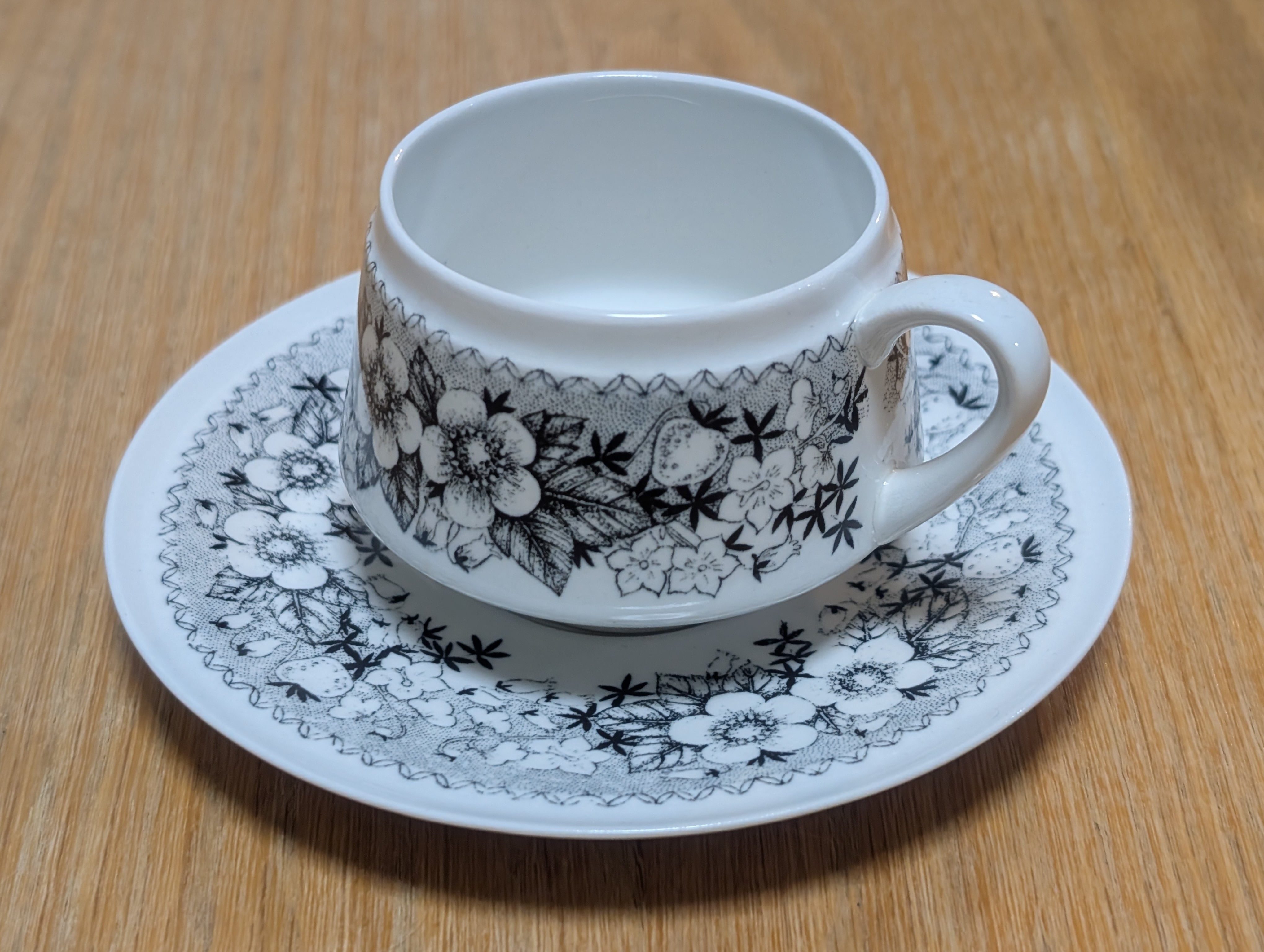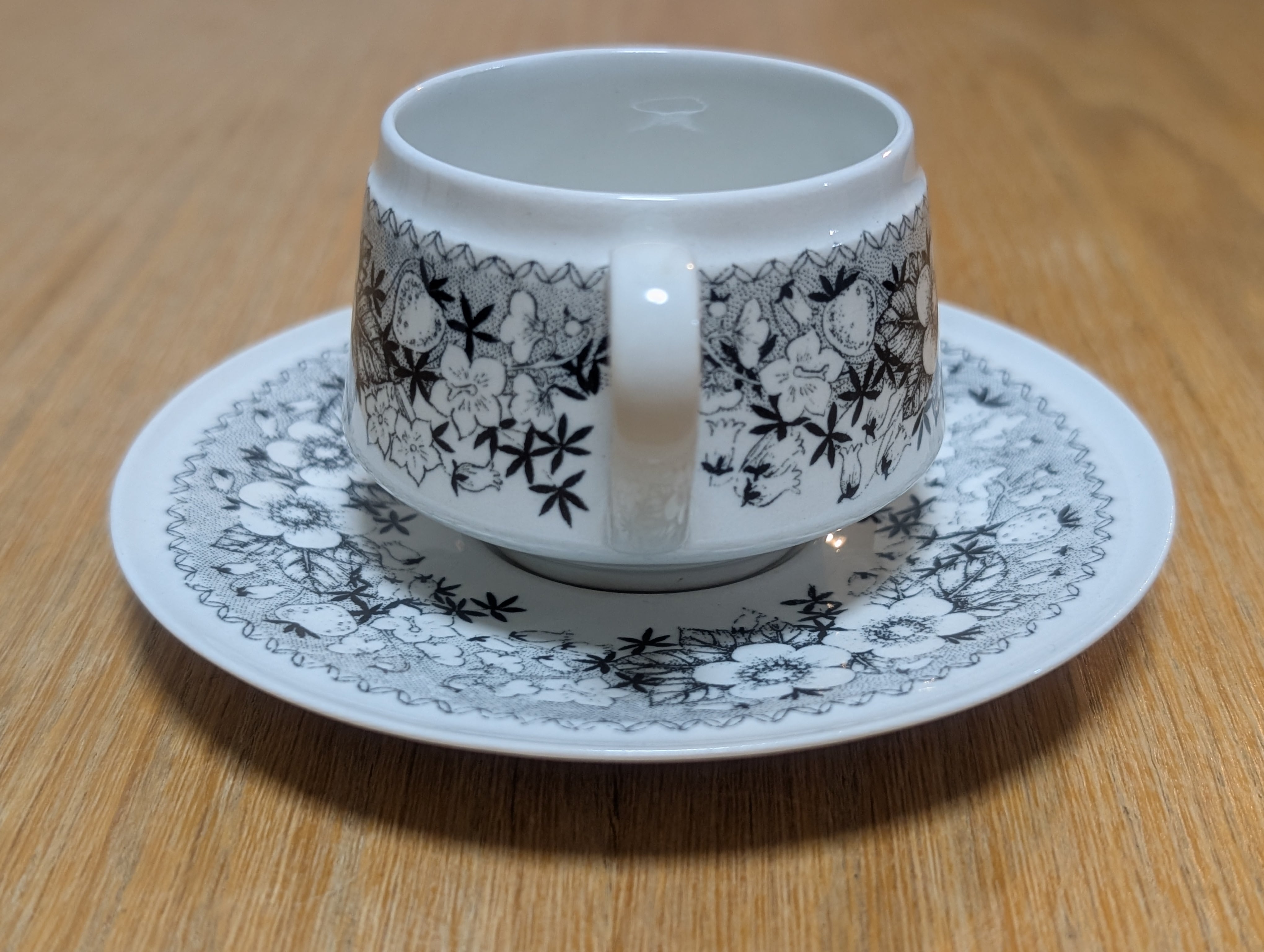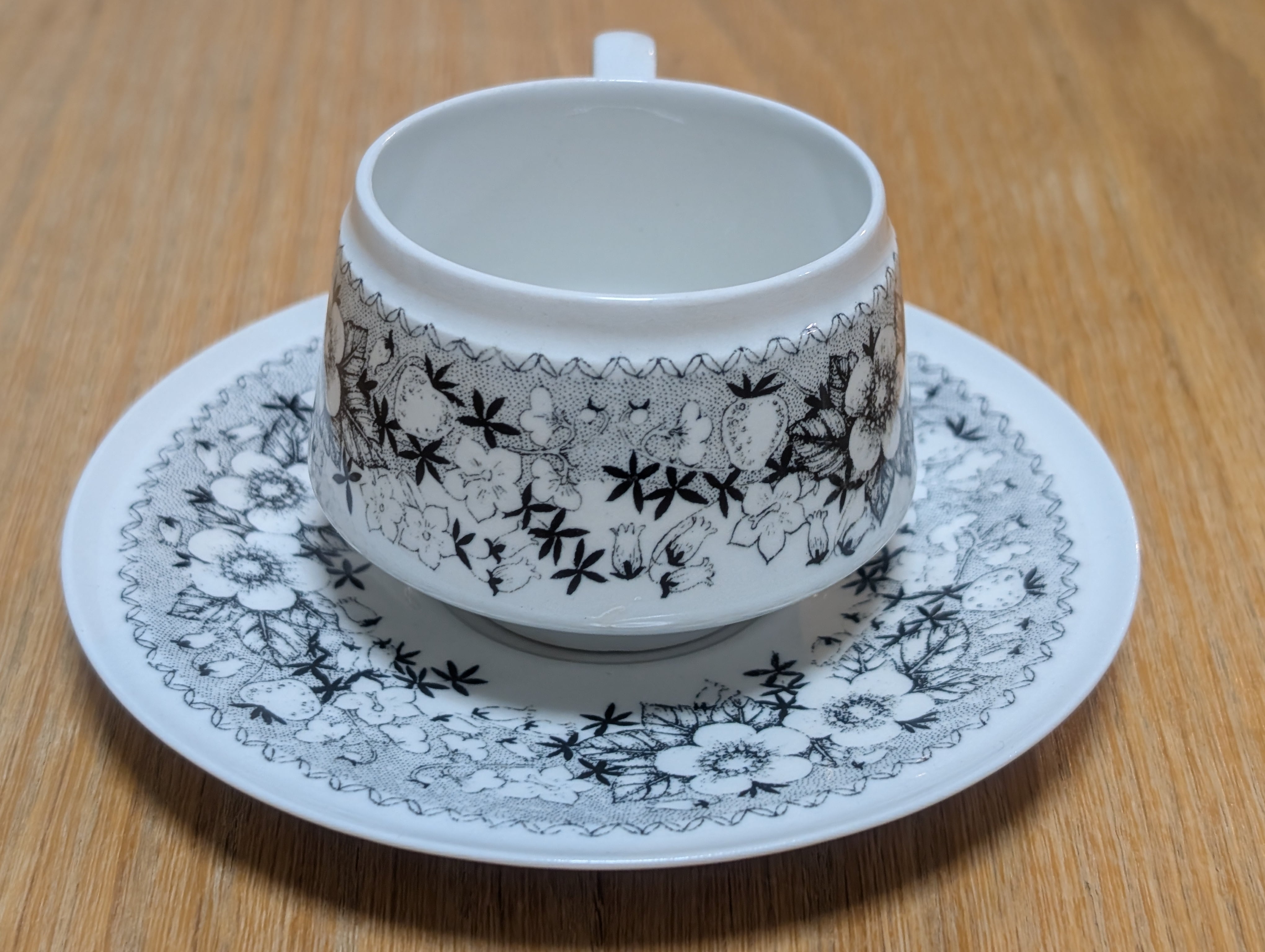 モノトーンで描かれた草花と苺の模様がとても可愛らしく、フィンランド国内でも人気が高く希少なシリーズです。