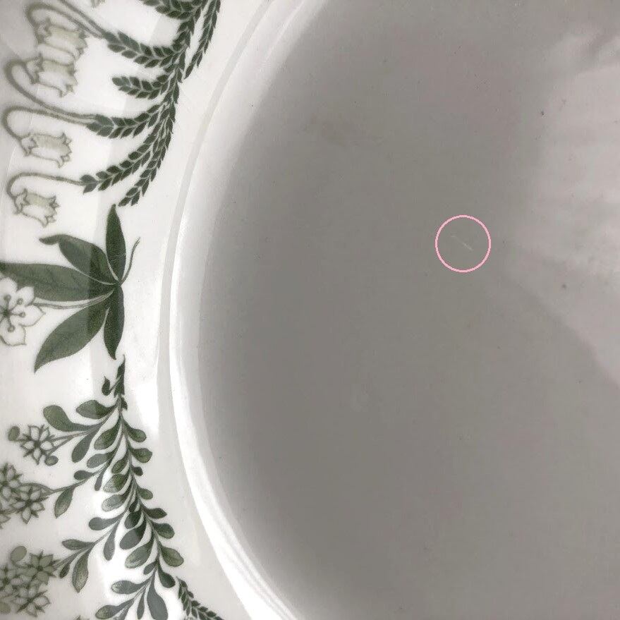 生産時からの小さな黒い点やプリントに多少不正確な箇所、茶色の塗料の飛び、また釉薬に小さな気泡やへこみなどの箇所が見られる場合があります。プレートの裏に支柱あとが3か所ほど見られる場合があります。これらはいずれも北欧ヴィンテージ食器の特性となります。