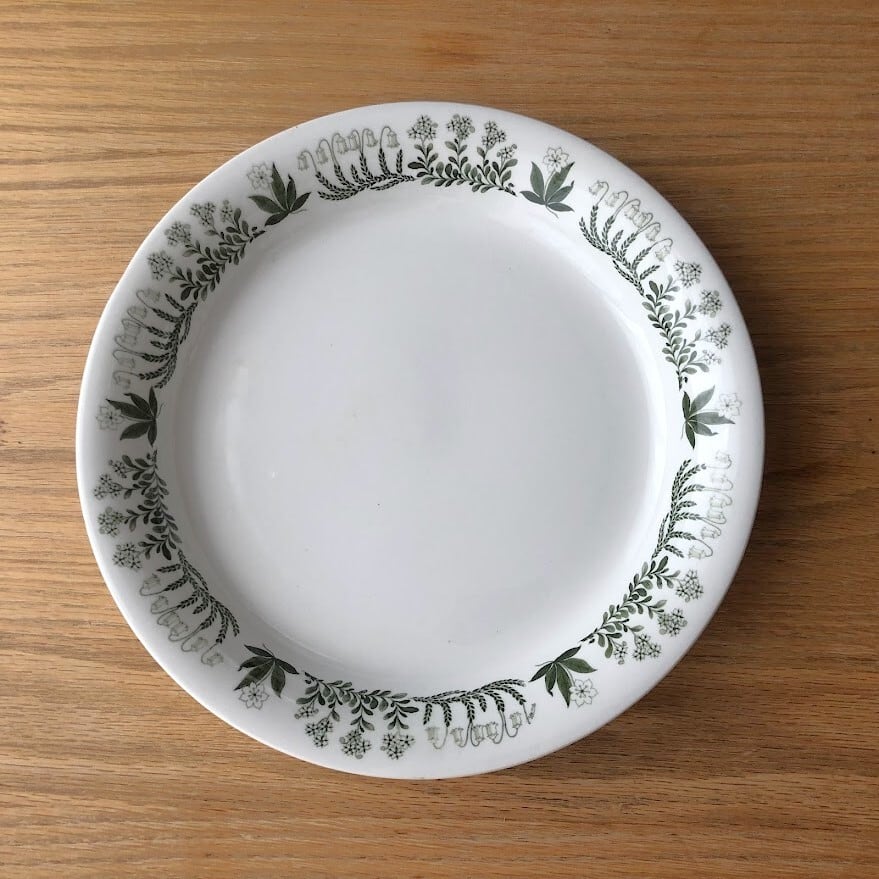 白いプレートのリムに小さな花々がぐるりと描かれた可憐なプレート。